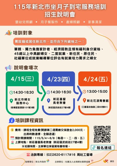 2、115年4月23日(星期四)14時30分至16時30時,假新北市新莊區武前街27 號 4 樓(臺灣基督長老教會新莊教會)辦理。